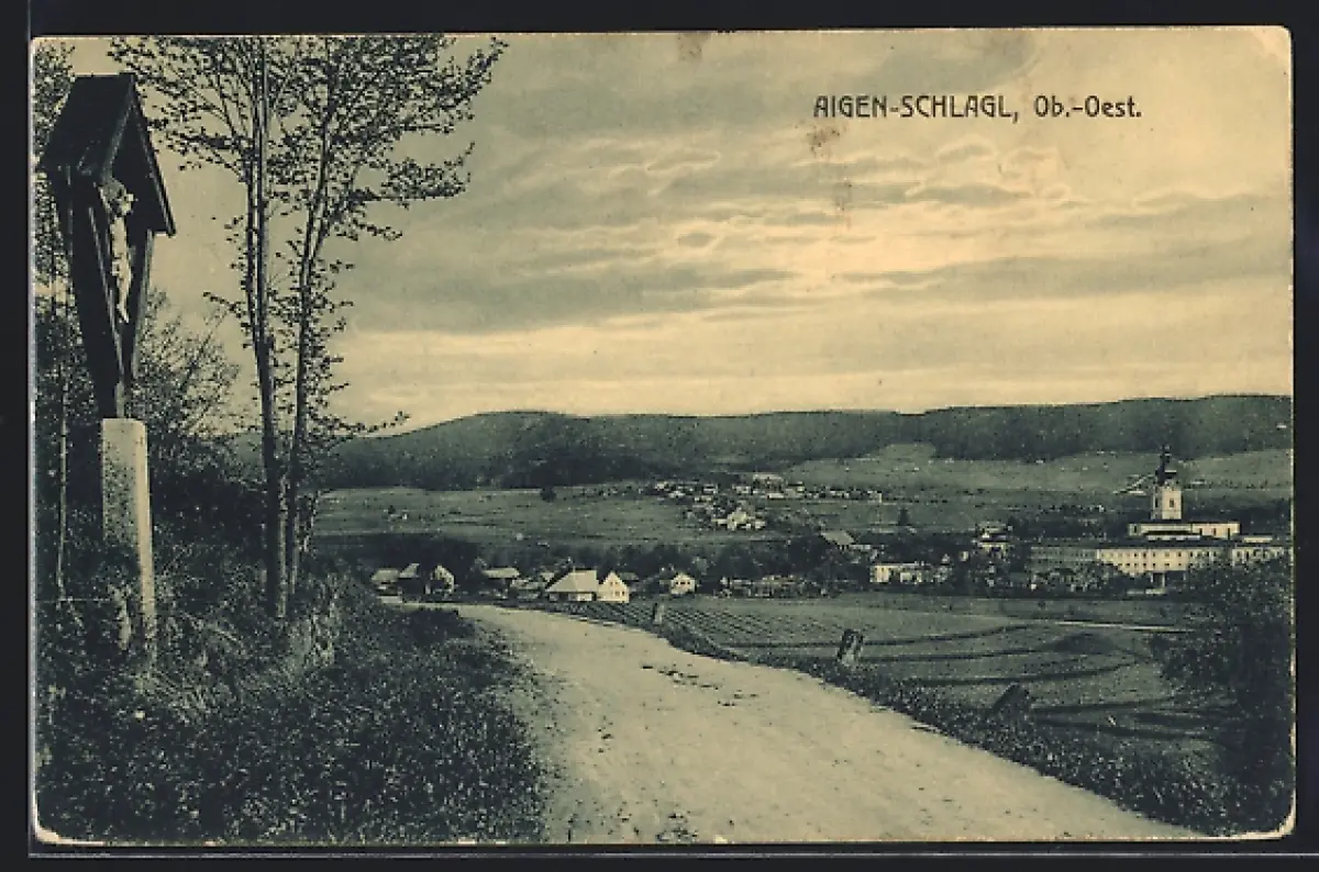 AK Aigen-Schlagl /Ob.-Oest., Wegkreuz mit Blick zur Ortschaft