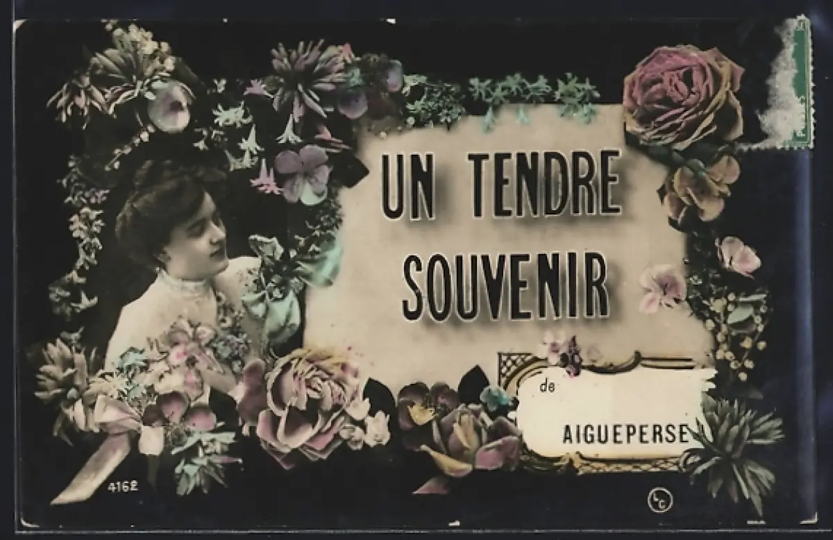 AK Aigueperse, Un tendre souvenir avec fleurs et femme élégante