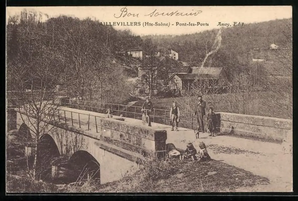 AK Aillevillers /Hte-Saône, Pont-les-Ports avec des passants et vue sur le village en arrière-plan