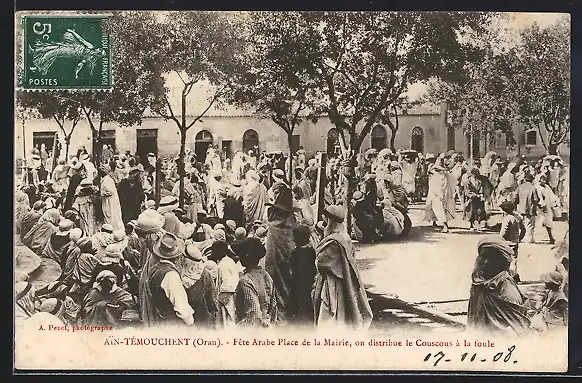 AK Ain-Témouchent, Fete Arabe Place de la Mairie, on distribue le Couscous à la foule