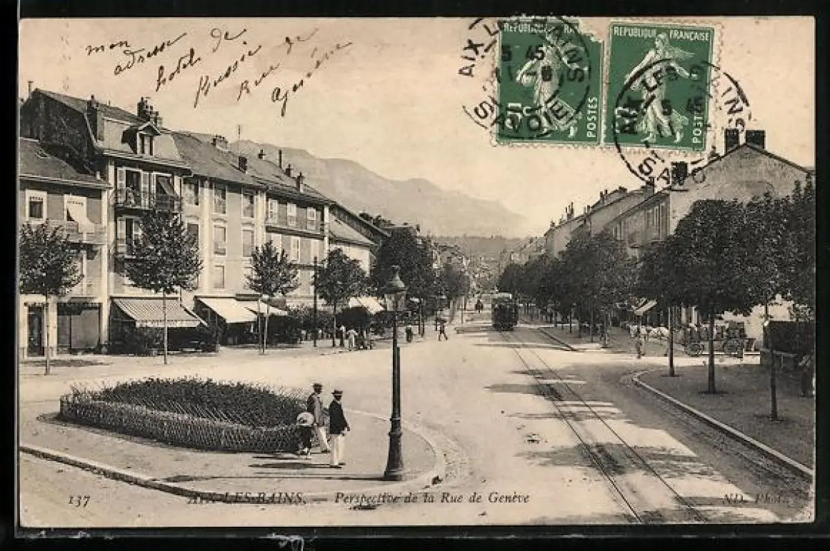 AK Aix-les-Bains, Perspective de la Rue de Geneve, Strassenbahn