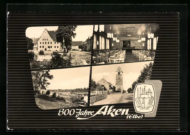 AK Aken /Elbe, Rathaus, Speisesaal VEB Flachglaswerk, Pegelhäuschen mit Fähre, 800 Jahre Aken, Wappen
