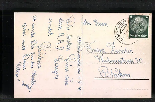Personenbezogene Daten auf der Rückseite der Karte wurden durch blauen Textmarker unkenntlich gemacht. Die blauen Stellen sind auf die Vorderseite durchgeweicht und wirken sich negativ auf das Postkartenfoto aus