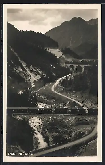 AK Albulabahn mit Gebirgskette und Viaduct