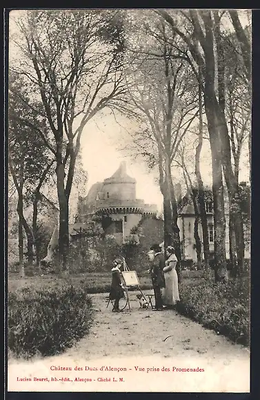 AK Alencon, Château des Ducs d`Alencon, vue prise des Promenades, un enfant devant un chevalet et ses parents