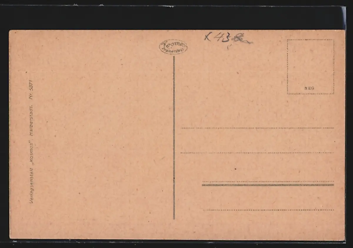 Personenbezogene Daten auf der Rückseite der Karte wurden durch blauen Textmarker unkenntlich gemacht. Die blauen Stellen sind auf die Vorderseite durchgeweicht und wirken sich negativ auf das Postkartenfoto aus