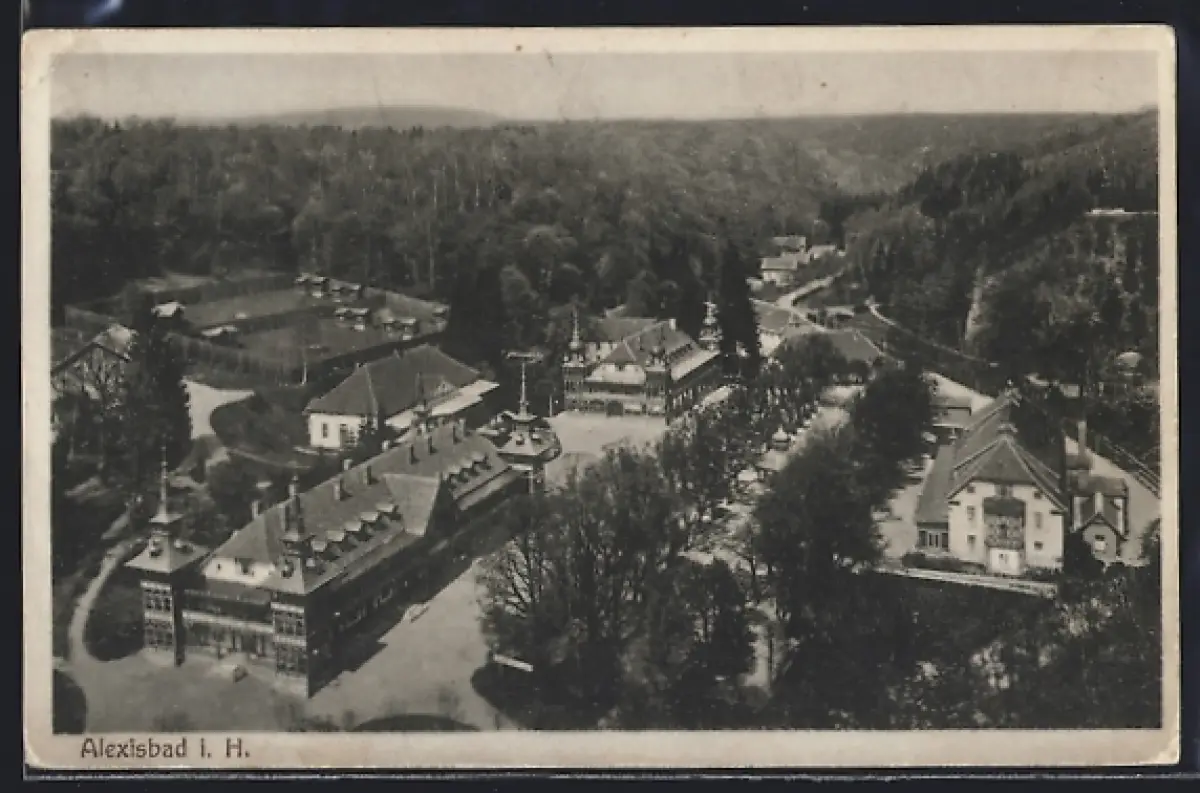 AK Alexisbad i. H., Ortsansicht mit Kurgebäuden und Wald