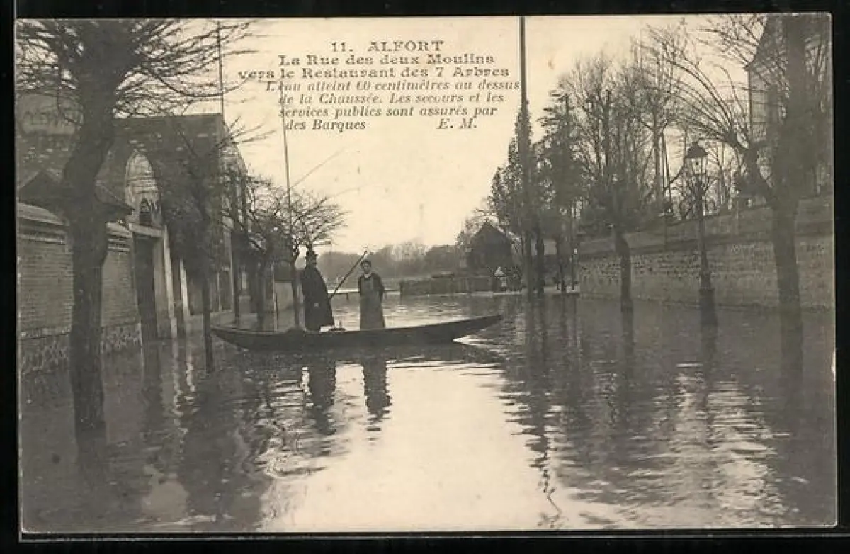 AK Alfort, Inondations 1910, La rue des deux Moulins vers le restaurant des 7 arbres, Hochwasser