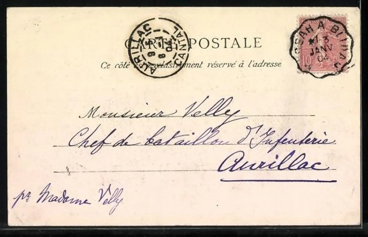 Personenbezogene Daten auf der Rückseite der Karte wurden durch blauen Textmarker unkenntlich gemacht. Die blauen Stellen sind auf die Vorderseite durchgeweicht und wirken sich negativ auf das Postkartenfoto aus