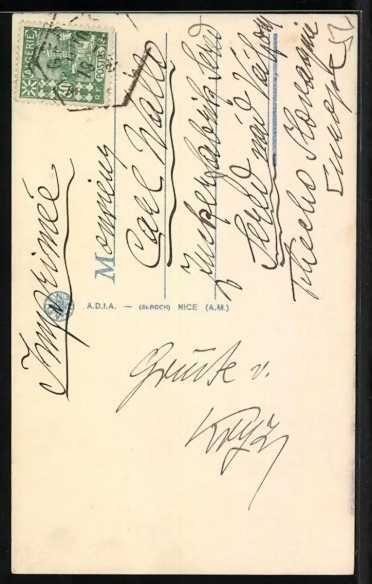 Personenbezogene Daten auf der Rückseite der Karte wurden durch blauen Textmarker unkenntlich gemacht. Die blauen Stellen sind auf die Vorderseite durchgeweicht und wirken sich negativ auf das Postkartenfoto aus