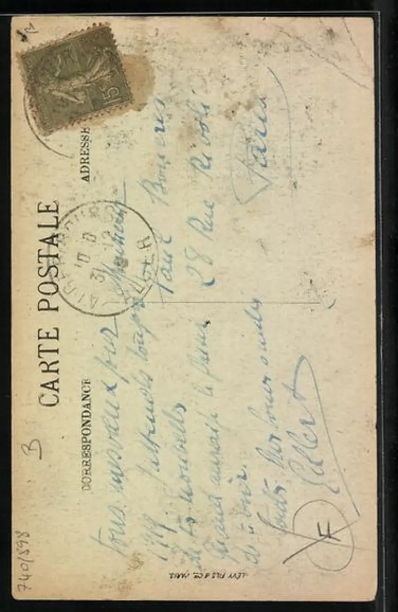 Personenbezogene Daten auf der Rückseite der Karte wurden durch blauen Textmarker unkenntlich gemacht. Die blauen Stellen sind auf die Vorderseite durchgeweicht und wirken sich negativ auf das Postkartenfoto aus