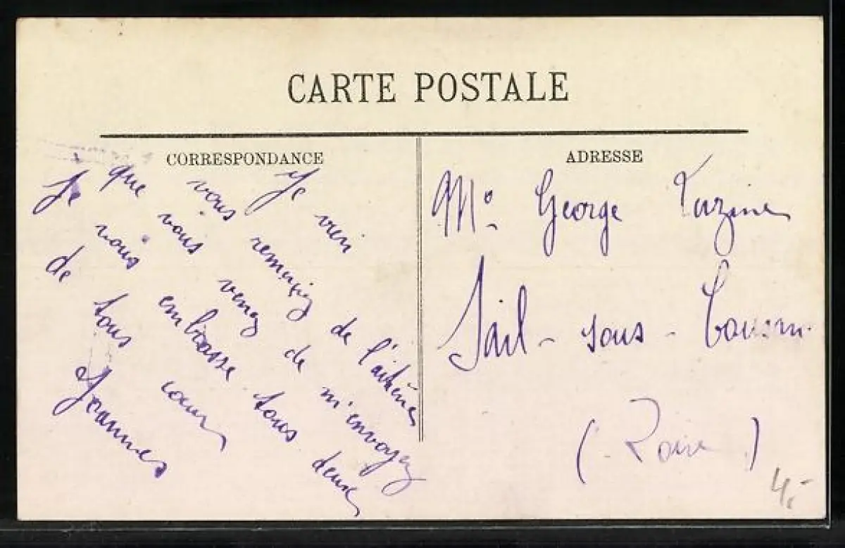 Personenbezogene Daten auf der Rückseite der Karte wurden durch blauen Textmarker unkenntlich gemacht. Die blauen Stellen sind auf die Vorderseite durchgeweicht und wirken sich negativ auf das Postkartenfoto aus