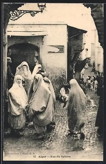 AK Alger, Rue du Sphinx, Fontaine et Portail, verschleierte arabische Frauen