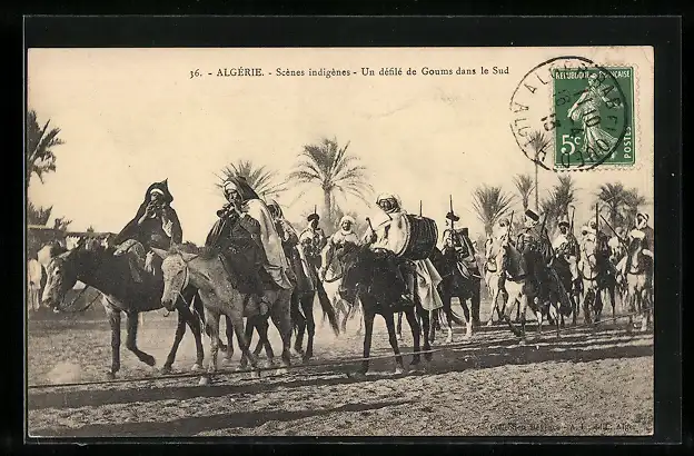 AK Algérie, Un défilé de Goums dans le Sud, Algerischer Trommler auf einem Pferd