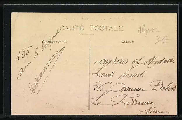 Personenbezogene Daten auf der Rückseite der Karte wurden durch blauen Textmarker unkenntlich gemacht. Die blauen Stellen sind auf die Vorderseite durchgeweicht und wirken sich negativ auf das Postkartenfoto aus