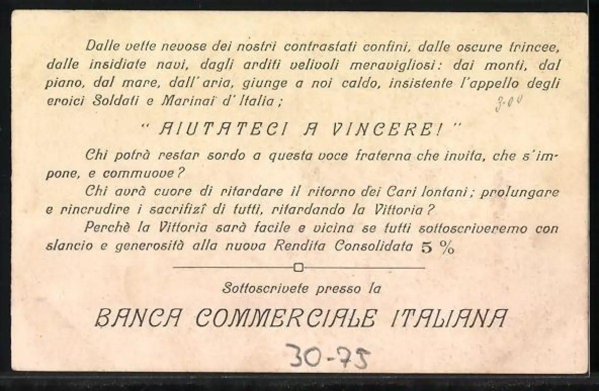 AK Allegorische Figur der Italia mit Nationalflagge, Speer, Lorbeerkranz, Wappen, Kriegsanleihe Banca Commerciale Italia