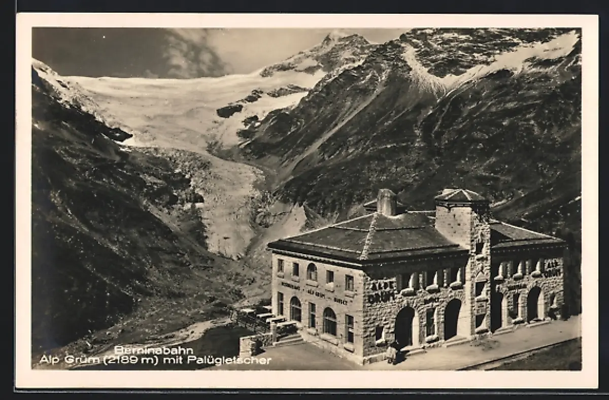 AK Alp Grüm, Bahnhof der Berninabahn mit Palügletscher