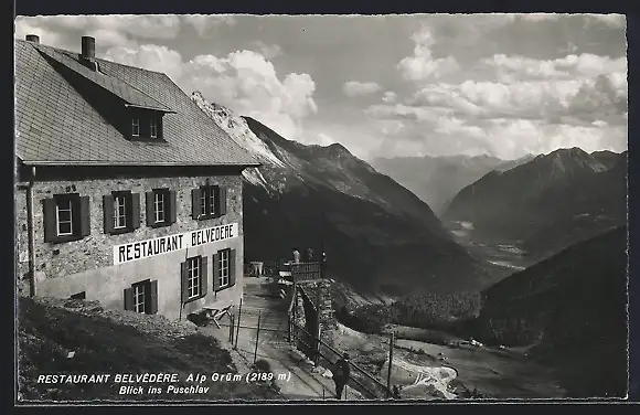 AK Alp Grüm, Restaurant Belvédère mit Blick ins Puschlav