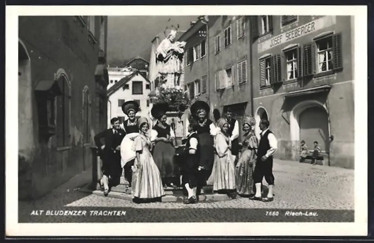 AK Alt Bludenzer Trachten, Anwohner vor dem Geschäft von Josef Seeberger