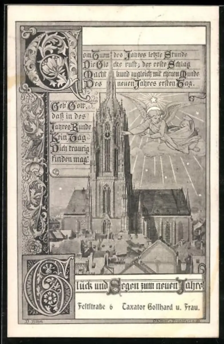 AK Alt-Frankfurt, Blick auf den Dom, Neujahrsgruss Taxator Gollhard und Frau, Feststrasse 6
