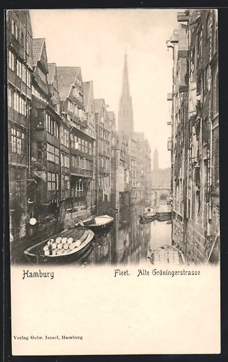 AK Alt-Hamburg, Fleet alte Gröningerstrasse mit Kirche und Booten