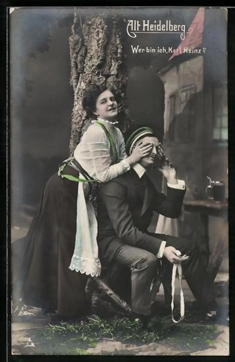 AK Alt-Heidelberg, Hübsche Frau steht hinter dem Student und hält ihm die Augen zu