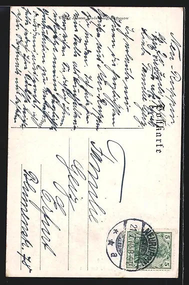 Personenbezogene Daten auf der Rückseite der Karte wurden durch blauen Textmarker unkenntlich gemacht. Die blauen Stellen sind auf die Vorderseite durchgeweicht und wirken sich negativ auf das Postkartenfoto aus