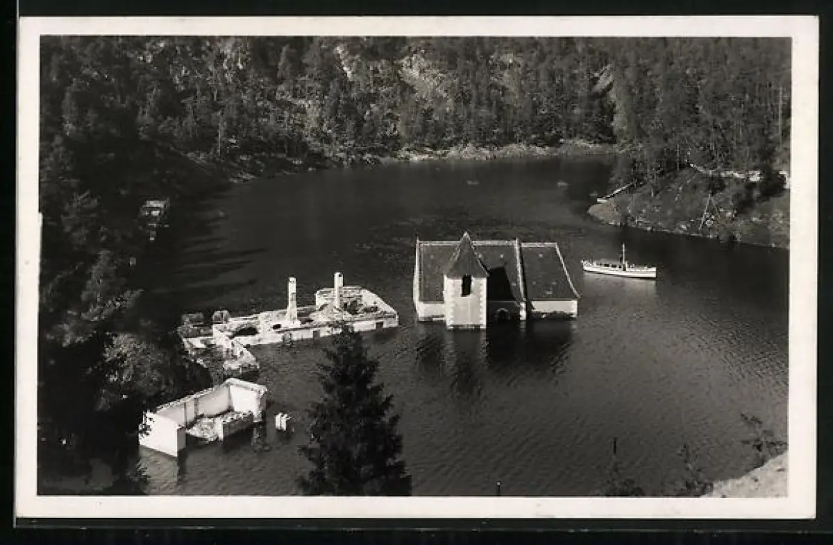 AK Alt-Vöttau, Kirche im Stausee unterhalb des Wasserspiegels mit einem Ausflugsdampfer