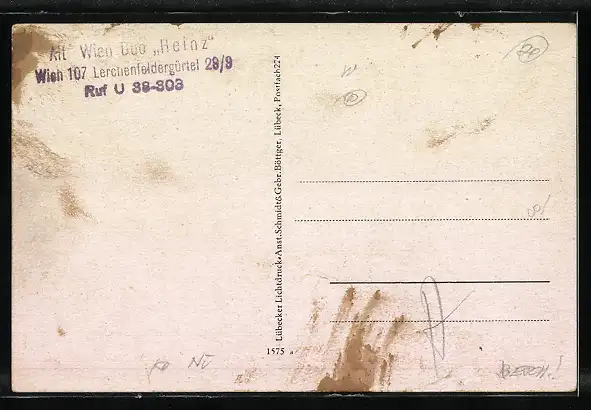 Personenbezogene Daten auf der Rückseite der Karte wurden durch blauen Textmarker unkenntlich gemacht. Die blauen Stellen sind auf die Vorderseite durchgeweicht und wirken sich negativ auf das Postkartenfoto aus