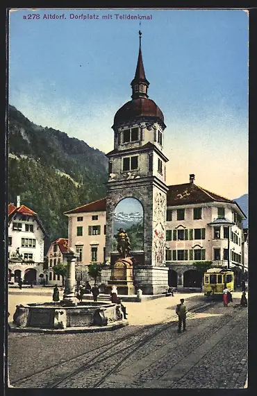 AK Altdorf, Strassenbahn auf dem Dorfplatz mit Telldenkmal