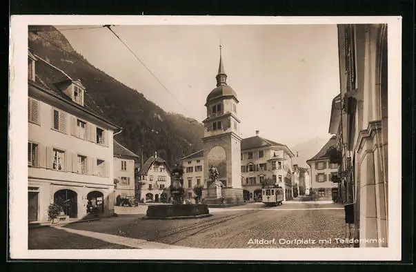 AK Altdorf, Strassenbahn mit Telldenkmal