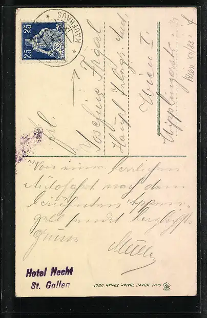 Personenbezogene Daten auf der Rückseite der Karte wurden durch blauen Textmarker unkenntlich gemacht. Die blauen Stellen sind auf die Vorderseite durchgeweicht und wirken sich negativ auf das Postkartenfoto aus