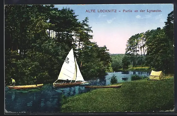 AK Alte Löcknitz, Partie an der Lyraecke, Segelboot, Zelt