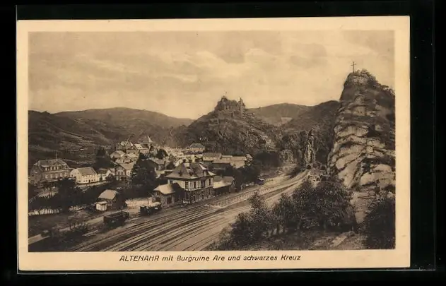 AK Altenahr, Burgruine Are und schwarzes Kreuz m. Bahnhof