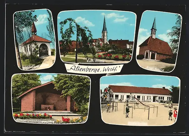 AK Altenberge /Westf., Waltruper Kapelle, Kath. Kirche, Evgl. Kirche, Kriegergedächtniskapelle, Kindergarten