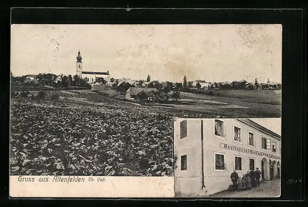 AK Altenfelden /Ob. Oest., Gasthaus und Handlung L. Wegerbauer, Ortsansicht mit Kirche