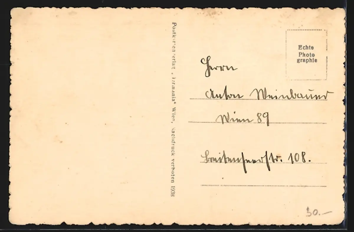 Personenbezogene Daten auf der Rückseite der Karte wurden durch blauen Textmarker unkenntlich gemacht. Die blauen Stellen sind auf die Vorderseite durchgeweicht und wirken sich negativ auf das Postkartenfoto aus