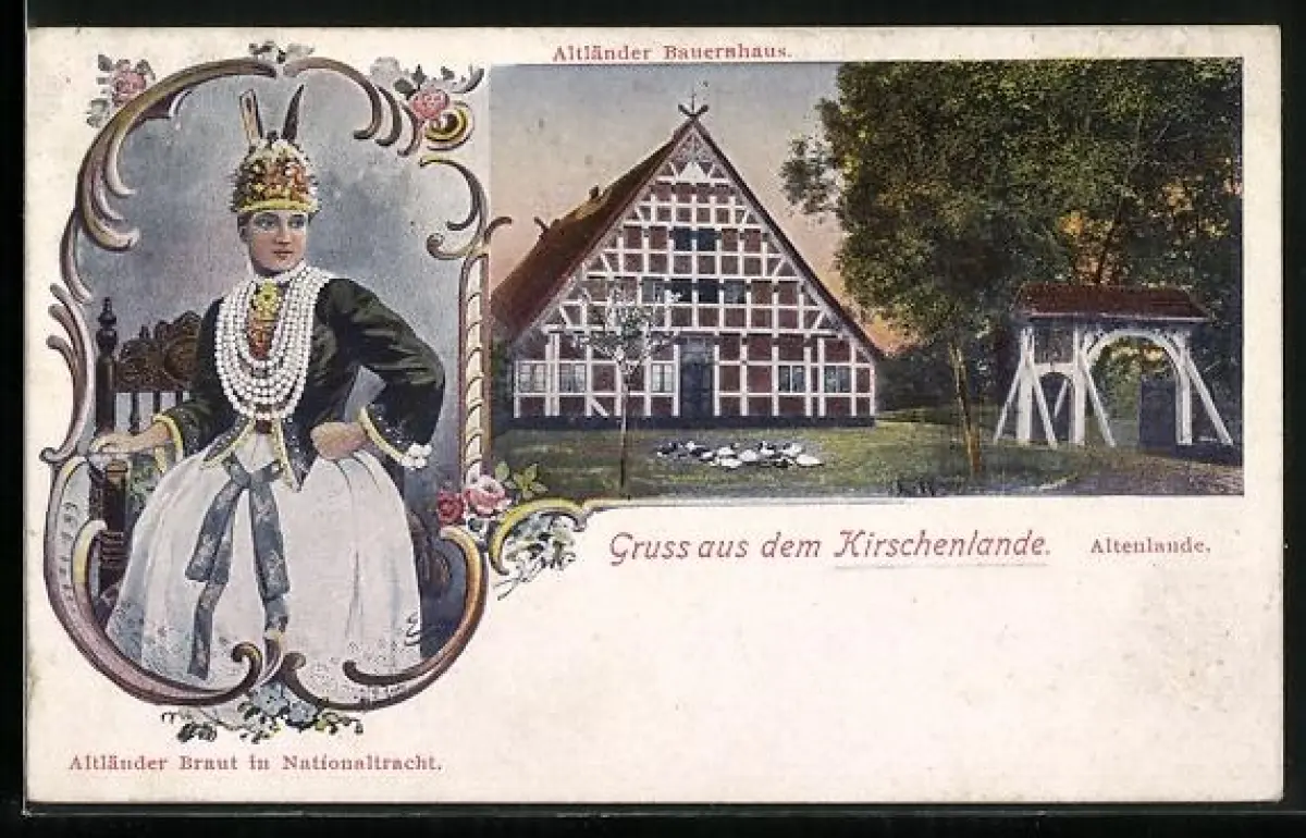 AK Altenlande, Altländer Braut in Nationaltracht, Altes Bauernhaus
