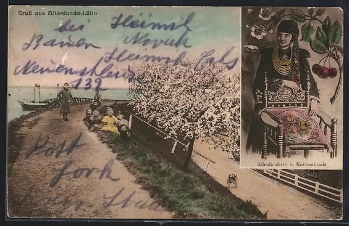 AK Altenlande-Lühe, Uferpartie und Altenländerin in Nationaltracht