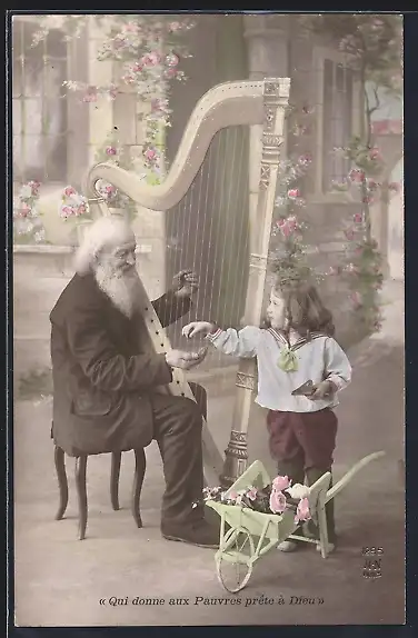 AK Alter Mann an einer Harfe, Mädchen mit Schubkarre, Rosen