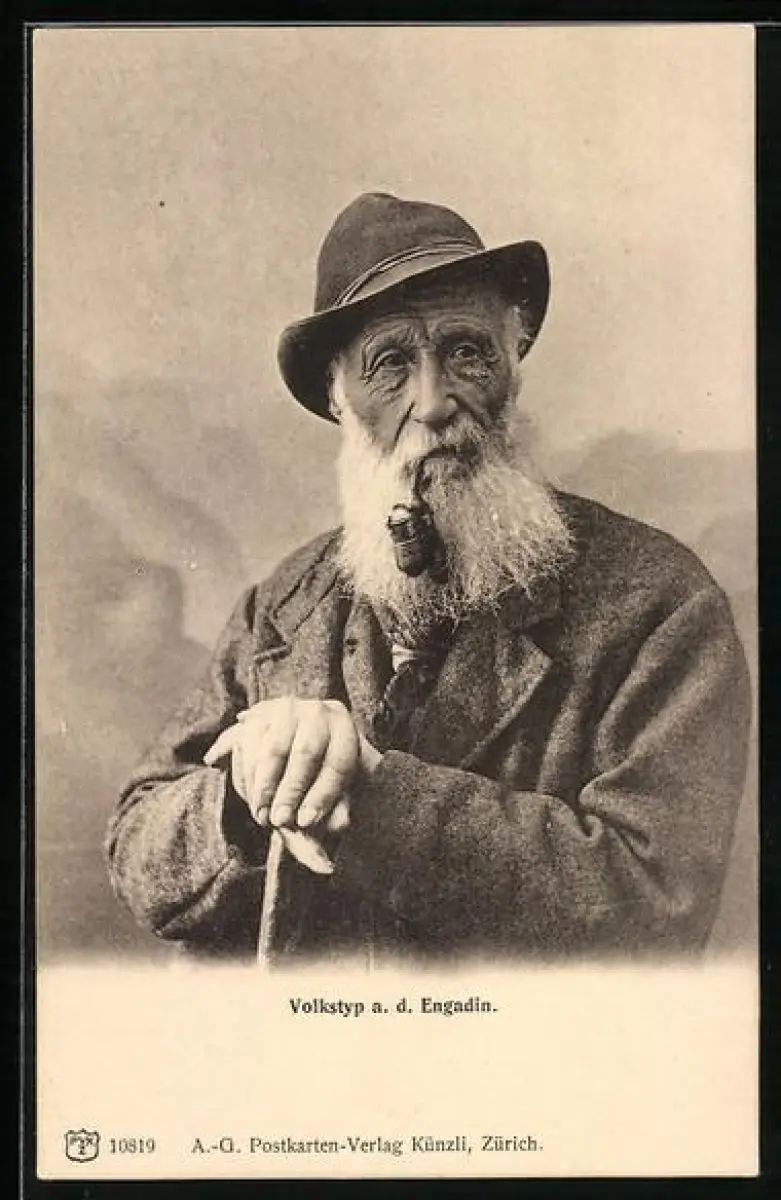 AK Alter Mann aus dem Engadin mit Pfeife und Stock