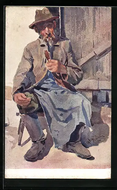 AK Alter tschechischer Mann in Schürze mit Tabakspfeife