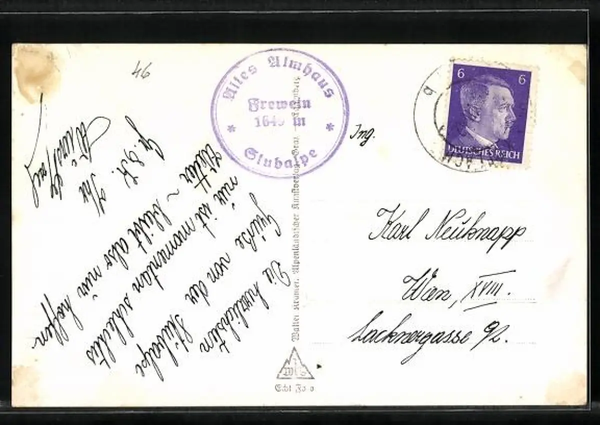 Personenbezogene Daten auf der Rückseite der Karte wurden durch blauen Textmarker unkenntlich gemacht. Die blauen Stellen sind auf die Vorderseite durchgeweicht und wirken sich negativ auf das Postkartenfoto aus