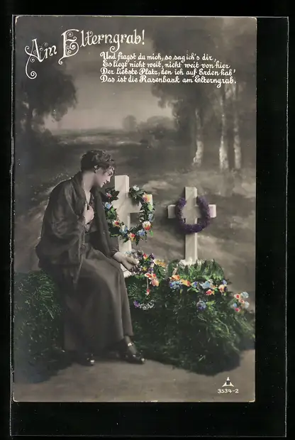 AK Am Elterngrab, Frau trauert am Grabe ihrer Eltern