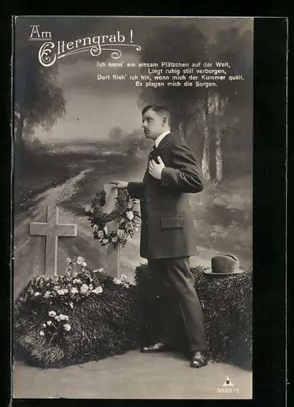 AK Am Elterngrab, Mann trauert voller Kummer am Grab seiner Eltern