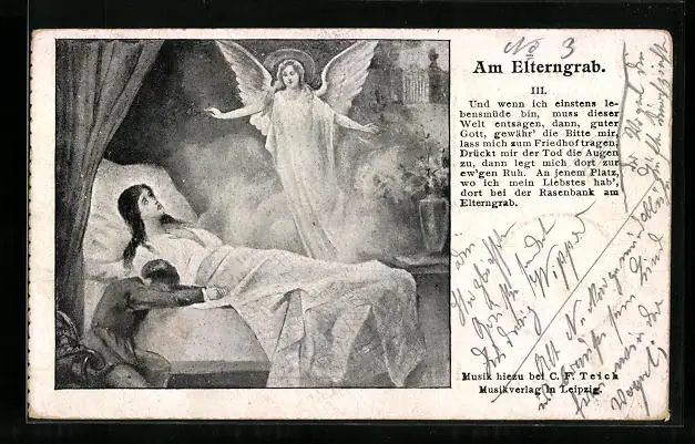 AK Am Elterngrab, Trauernde mit Engelserscheinung, Vers