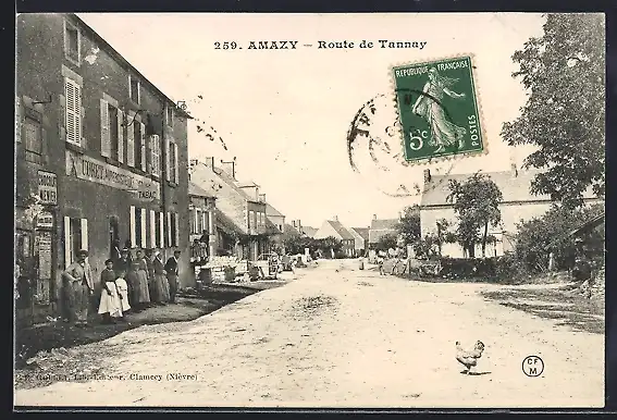 AK Amazy, Route de Tannay avec habitants devant le café et poule sur la route