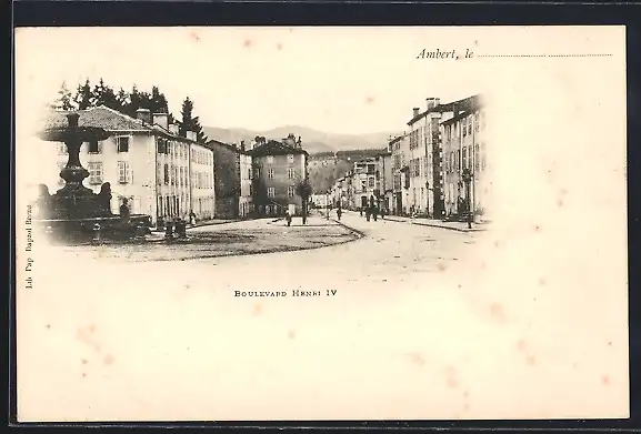 AK Ambert, Boulevard Henri IV avec fontaine et bâtiments historiques