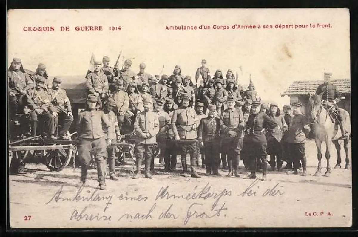 AK Ambulance d`un Corps d`Armée à son départ pour le front, Croquis de Guerre 1914