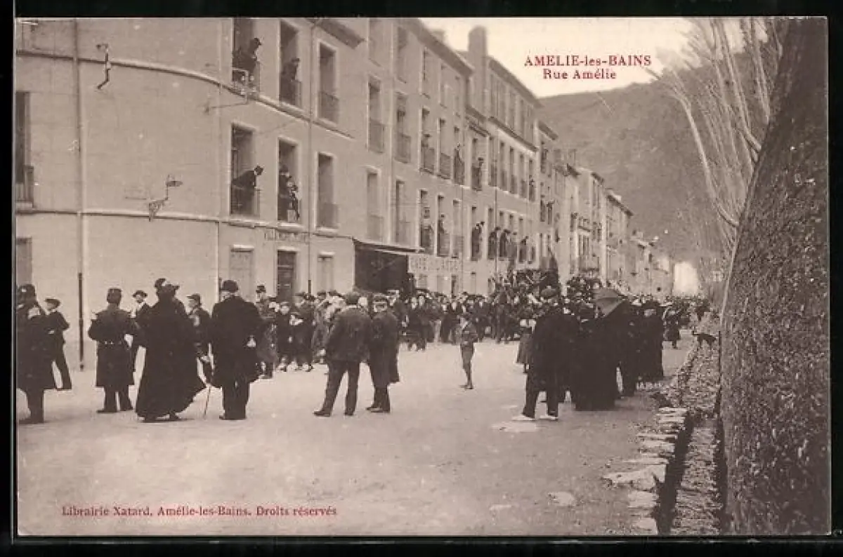 AK Amélie-les-Bains, Rue Amélie animée par des passants et des bâtiments historiques